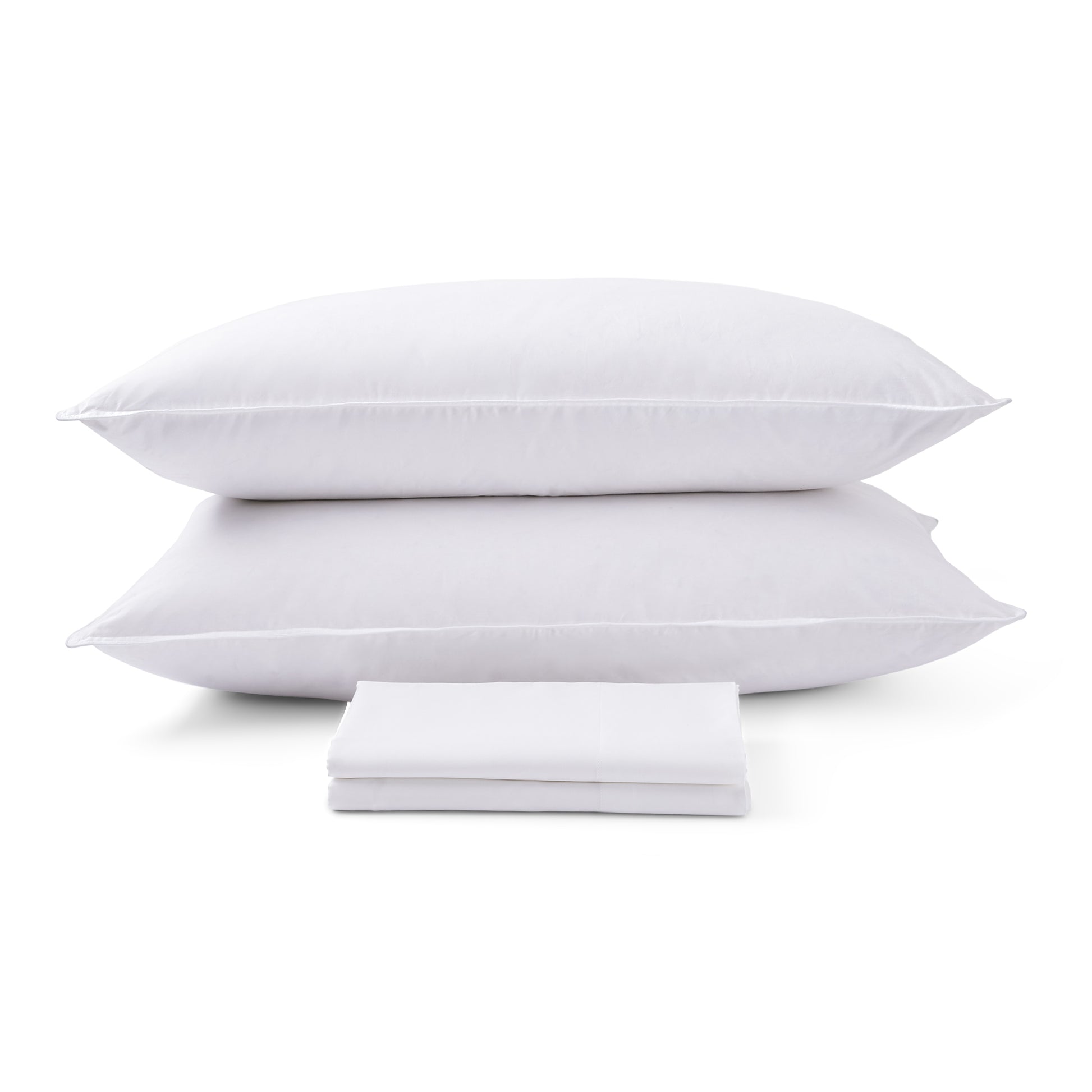 80% feather, 20% down 240 thread count, white 100% cotton cover Double-stitched and piped edges Single compartment construction, double covered Please note that we do not accept returns on pillows. All sales are final.