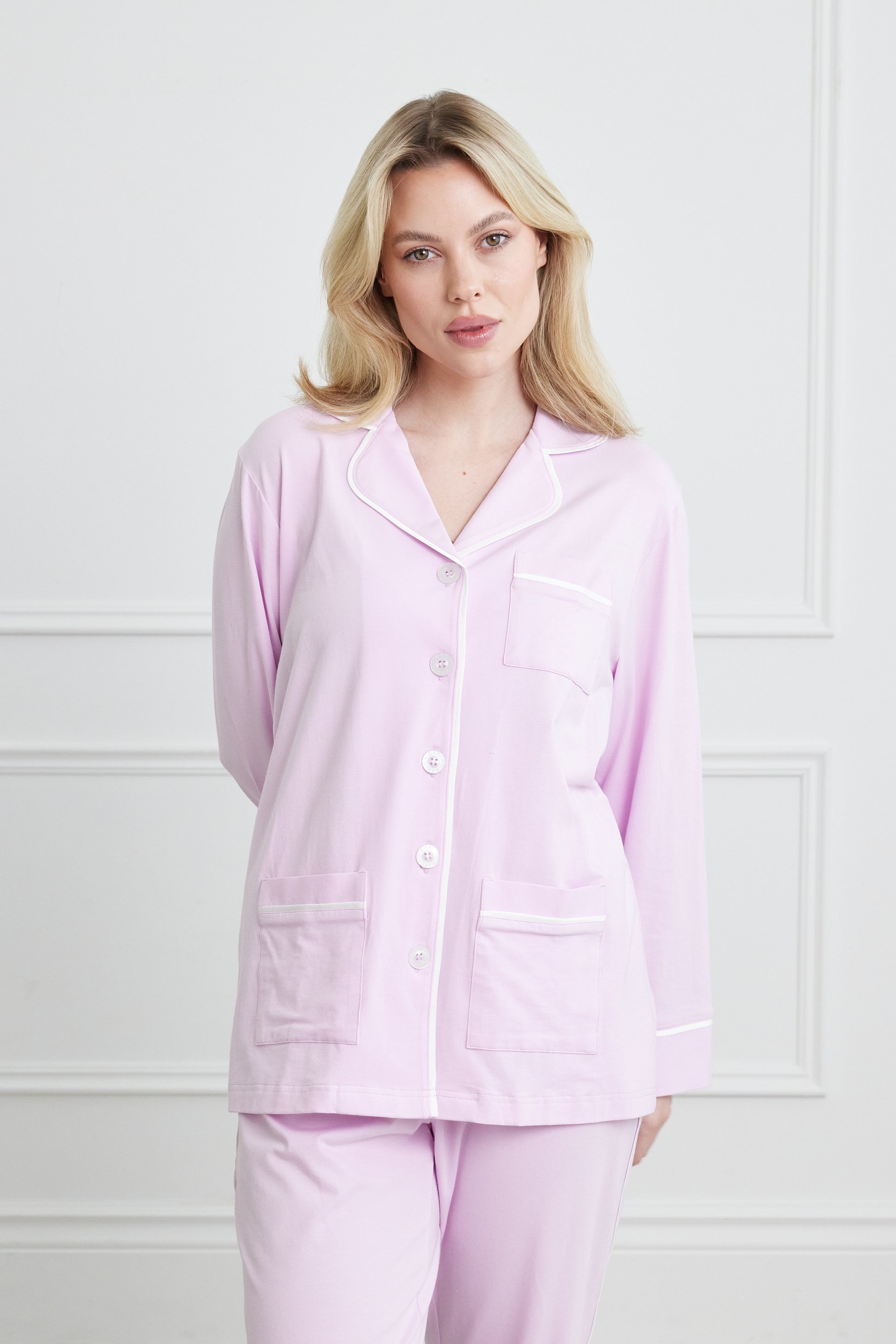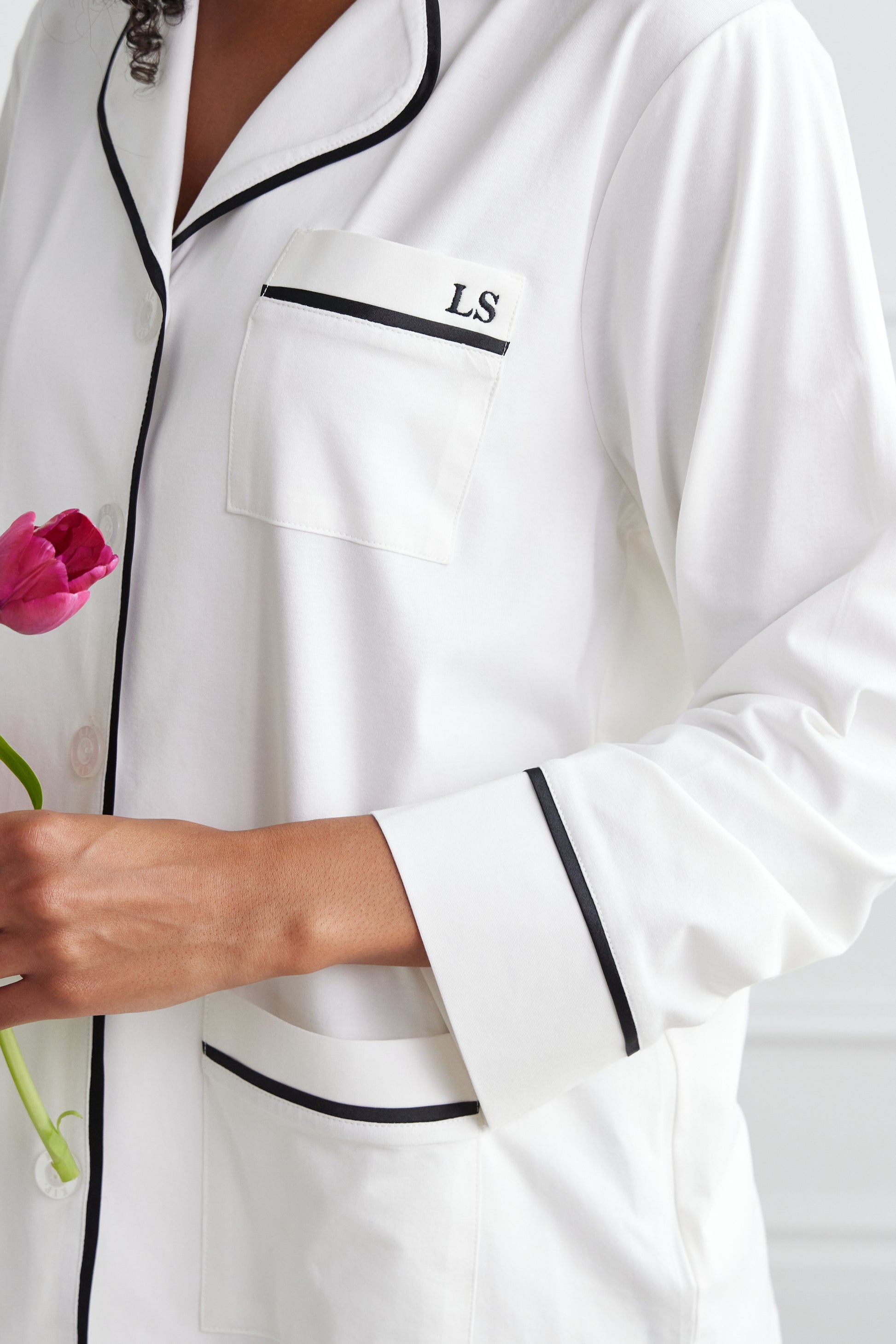 Curl up in our Luxe Stretch Cotton that feels incredibly soft on your skin while offering a chic, tailored look. The relaxed fit and comfortable, wide waistband feel dreamy overnight, while the contrast piping and modern pockets add polish to your before-bed and slow-morning style. Pair with our Pure Cashmere Long Robe and Cashmere Sleep Socks for the perfect effortless look.